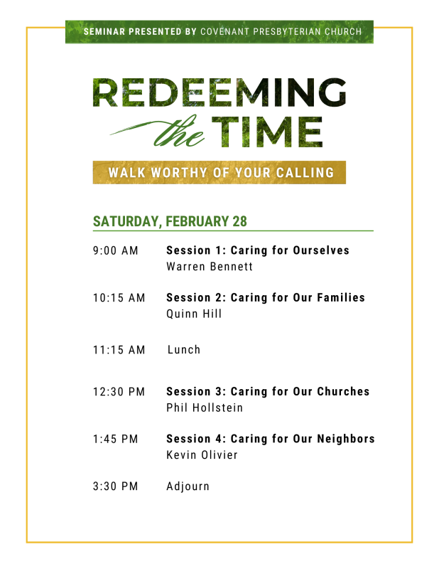 Join us Saturday, February 28, from 9 a.m. to 3:30 p.m. as Covenant Presbyterian Church presents its 2026 seminar “Redeeming the Time: Walk Worthy of Your Calling.” Lunch will be provided.